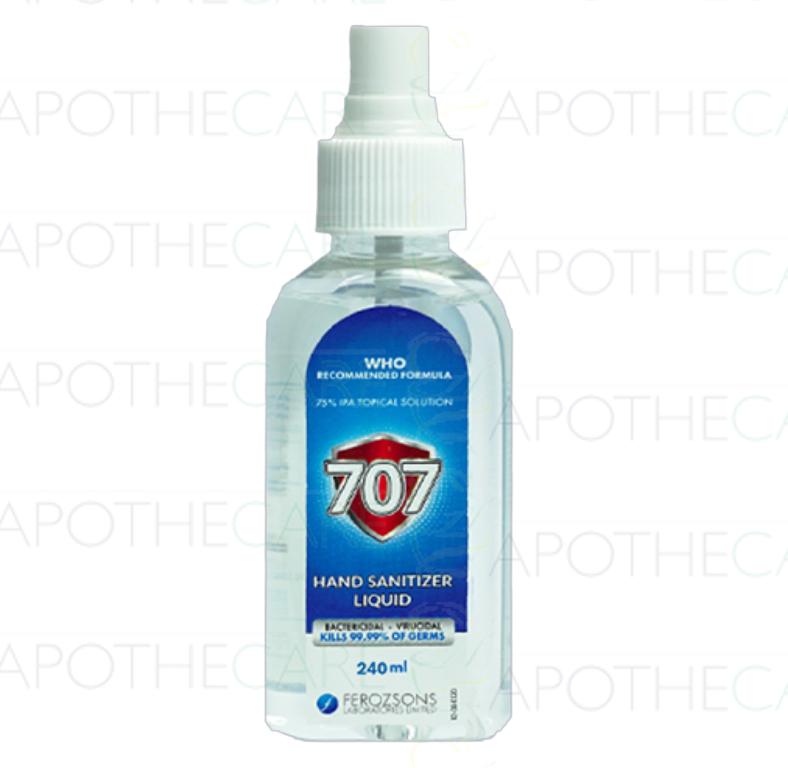 Product Name: 707 Hand Sanitizer Liquid Spray 240mlProduct Form: LiquidPack Size: 240mlMarketed By: Ferozsons Laboratories Limited Generic Category: Hand Sanitizer