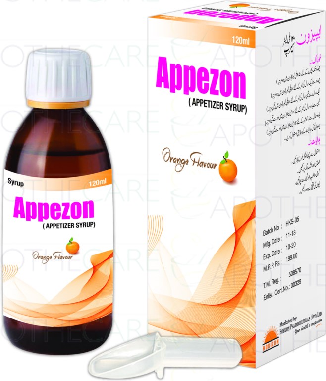 Product Name: Appezon Syp 120mlProduct Form: SyrupPack Size: 120mlMarketed By: Horizon Pharmaceuticals (PVT) LTDGeneric Category: Appetite StimulantIngredients: Appetizer Syrup