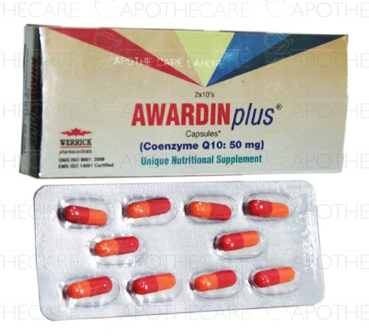 Product Name: Awardin Plus Cap 50mg 2x10'sProduct Form: CapsulesPack Size: 2x10'sMarketed By: Werrick PharmaceuticalsGeneric Category: Vitamins & MineralsIngredients: Co-Enzyme Q10