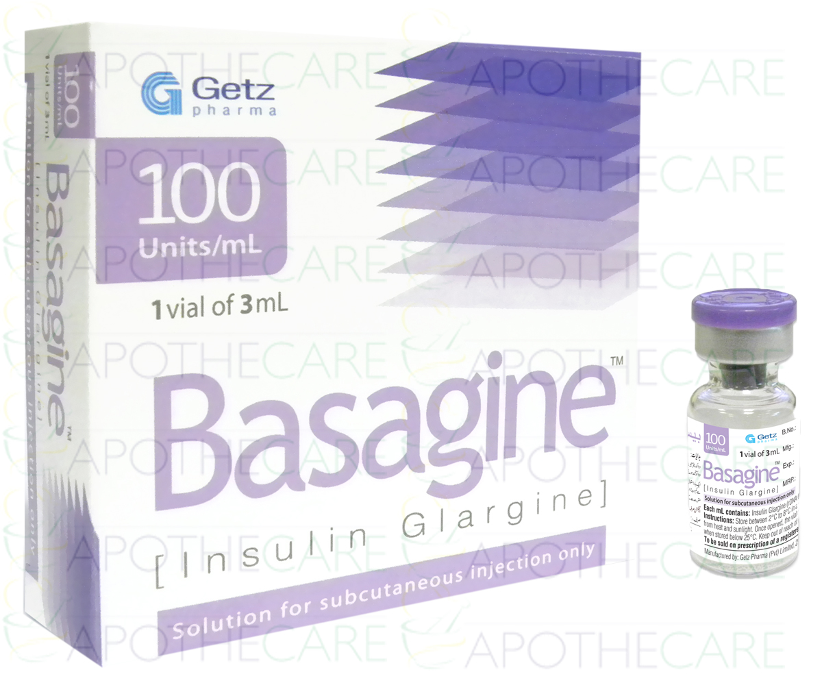 Product Name: Basagine Inj 100IU 1Vialx3mlProduct Form: InjectionPack Size: 1Vialx3mlMarketed By: GETZ PHARMA PAKISTAN (PVT) LTDGeneric Category: Long acting InsulinIngredients: Insulin glargine
