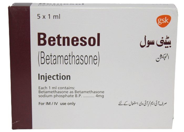 Product Name: Betnesol Inj 4mg 5Ampx1mlProduct Form: InjectionPack Size: 5Ampx1mlMarketed By: Glaxosmithkline Pakistan LimitedGeneric Category: CORTICOSTEROIDIngredients: Betamethasone Sodium Phosphate