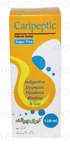 Product Name: Caripeptic Syp 120mlProduct Form: SyrupPack Size: 120mlMarketed By: Himont Pharma (Pvt) LtdGeneric Category: Anti-FlatulentIngredients: Each 10ml contains Zingiber officinale 200mg, Mentha piperita 100mg, Trachyspermum ammi 100mg, Foeniculum vulgare 100mg