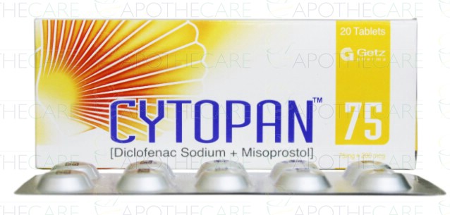Product Form: TabletPack Size: 100 Packs of 20'sMarketed By: GETZ PHARMA PAKISTAN (PVT) LTDGeneric Category: NSAID / Prostaglandins Ingredients: Diclofenac Sodium 75mg, Misoprostol 200mcg