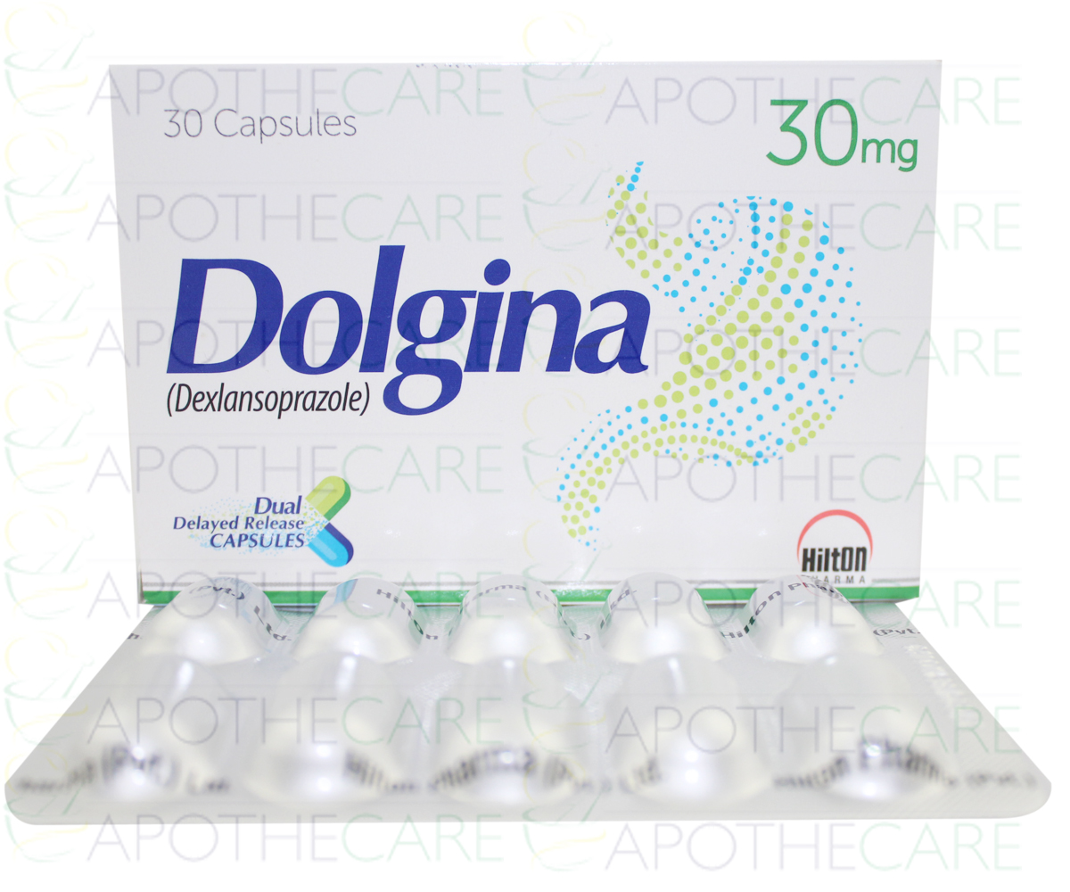 Product Name: Dolgina Cap 30mg 30'sProduct Form: CapsulesPack Size: 30'sManufacturer: Hilton PharmaGeneric Category: Anti-UlcerantIngredients: Dexlansoprazole