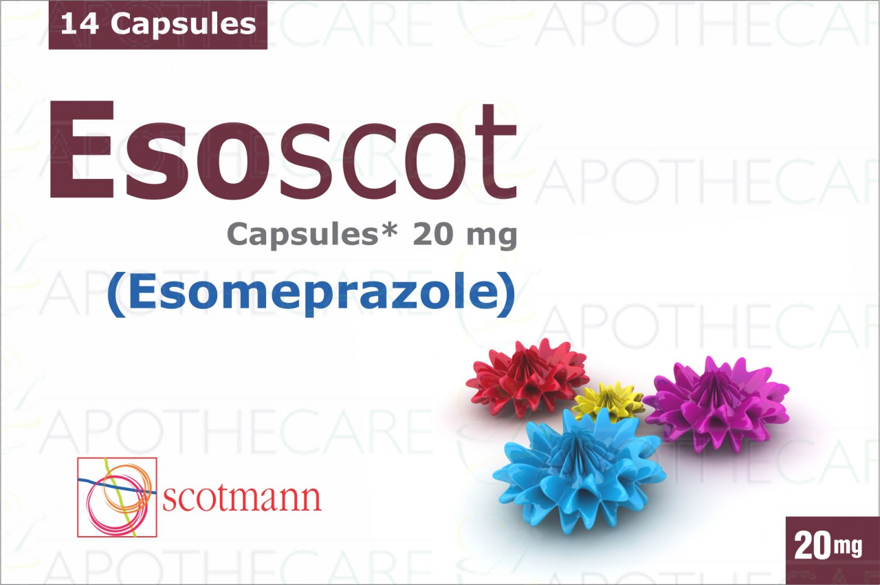 Product Name: Esoscot Cap 20mg 14'sProduct Form: CapsulesPack Size: 14'sMarketed By: Scotmann PharmaceuticalsGeneric Category: Anti-UlcerantIngredients: Esomeprazole