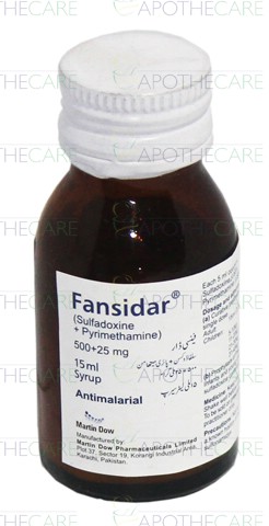 Product Name: Fansidar Susp 15mlProduct Form: SuspensionPack Size: 15mlMarketed By: MARTIN DOW PHARMACEUTICAL LIMITEDGeneric Category: Anti-MalarialIngredients: Each 5ml contains Sulfadoxine 500mg, Pyrimethamine 25mg