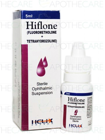 Product Name: Hiflone Eye Drops 5mlProduct Form: DropsPack Size: 5mlMarketed By: Helix Pharma (Pvt) LtdGeneric Category: Anti-AllergyIngredients: Fluorometholone 0.1% ,Tetrahydrazoline HCl 0.02%
