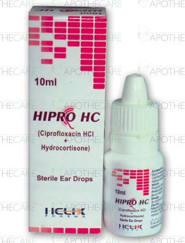 Product Name: Hipro HC Ear Drops 10mlProduct Form: DropsPack Size: 10mlMarketed By: Helix Pharma (Pvt) LtdGeneric Category: Anti-Bacterial + CorticosteroidsIngredients: Ciprofloxacin 2mg ,Hydrocortisone 10mg