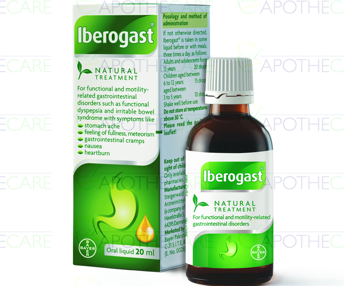 Product Name: Iberogast Sol 20mlProduct Form: SolutionPack Size: 20mlManufacturer: Bayer Pakistan(Pvt)LtdGeneric Category: Herbal