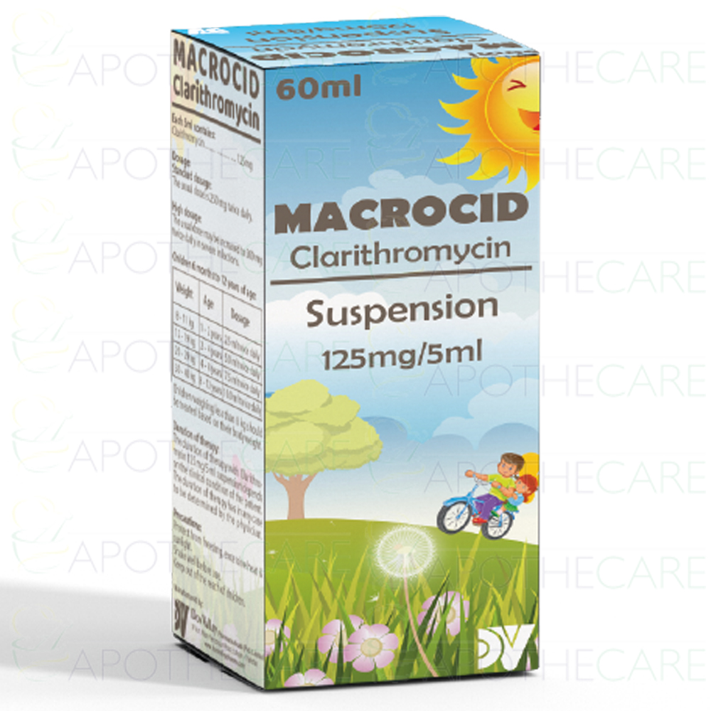 Product Name: MACROCID Syp 125mg 60mlProduct Form: SyrupPack Size: 60mlMarketed By: DON VALLEY PHARMA (PVT) LTDGeneric Category: MACROLIDE ANTI-BACTERIAL Ingredients: Clarithromycin