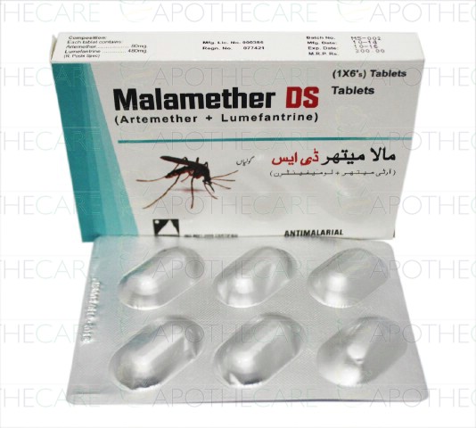 Product Name: Malamether Ds Tab 80mg/480mg 4's 330 PacksProduct Form: TabletsPack Size: 330 Packs of 4'sMarketed By: Rakaposhi PharmaceuticalsGeneric Category: Anti-MalarialIngredients: Artemether 80mg, Lumefartine 480mg