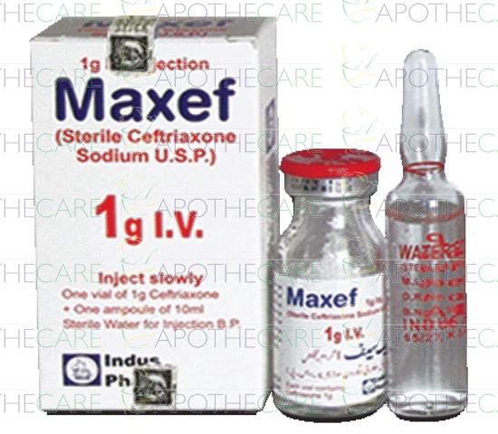 Product Name: Maxef IV Inj 1g 1VialProduct Form: InjectionPack Size: 1VialMarketed By: INDUS PHARMA (PVT) LTDGeneric Category: CEPHALOSPORIN ANTIBIOTICIngredients: Ceftriaxone Sodium