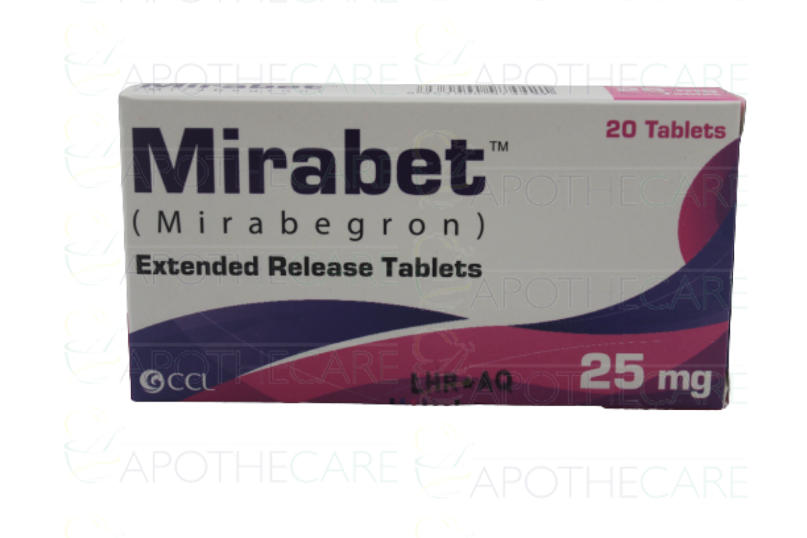Product Name: Mirabet Tab 25mg 20'sProduct Form: TabletsPack Size: 20'sManufacturer: CCL PharmaceuticalsGeneric Category: B-3 Adrenergic AgonistIngredients: Mirabegron 25mg