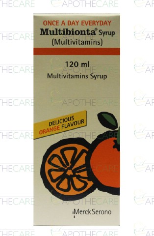 Product Name: Multibionta Syp 120mlProduct Form: SyrupPack Size: 120mlMarketed By: Martin Dow Pharmaceuticals (Pak) Ltd Generic Category: Vitamin SupplementIngredients: Each 5ml contain: Nicotinamide 10mg, Vitamin A 3000IU,Vitamin B2 1.2mg, Vitamin B1 1.5mg, Ascorbic Acid 50mg, Calcitriol 400IU, Cyanocobalamin 3mcg, Pyridoxine 1mg