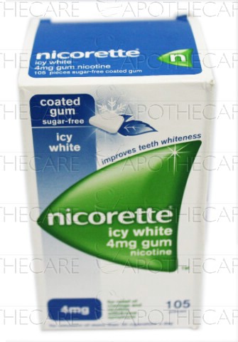 Product Name: Nicorette Icy White Nicotine Gum 4mg 105'sProduct Form: GumPack Size: 105'sMarketed By: Heal the WorldGeneric Category: Anti-Smoking AgentIngredients: Nicotine