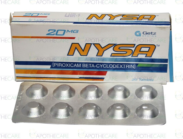 Product Name: Nysa Tab 20mg 20’s 96 PacksProduct Form: TabletPack Size: 96 Packs of 20’sMarketed By: GETZ PHARMA PAKISTAN (PVT) LTDGeneric Category: NSAIDIngredients: Piroxicam beta Cyclodextrin