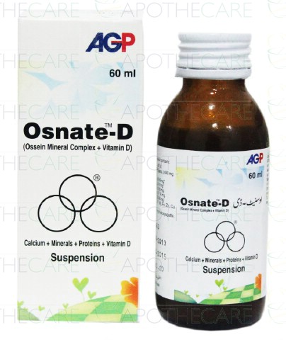 Product Name: Osnate D Susp 60mlProduct Form: SuspensionPack Size: 60mlMarketed By: AGP (Pvt) Ltd.Generic Category: Calcium and mineral supplementIngredients: Each 5 ml Contains: Vitamin D 400IU , Ossein Mineral Complex 400 mg
