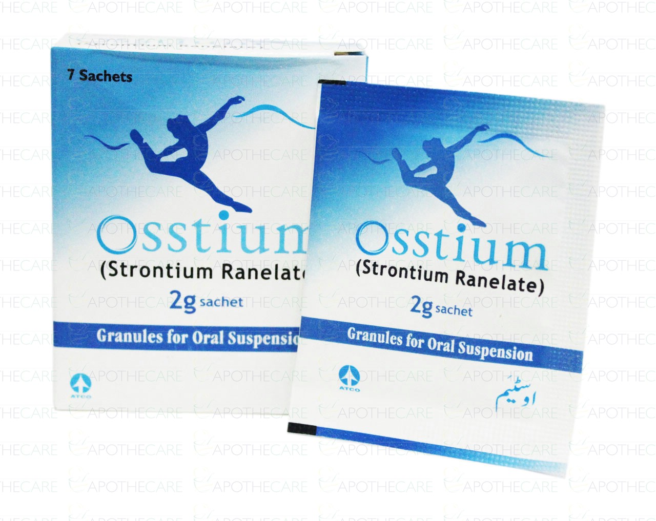 Product Name: Osstium Granule Sachets 2gm 7'sProduct Form: GranulesPack Size: 7'sMarketed By: ATCO LABORATORIES (PVT) LTDGeneric Category: Bone calcium regulators Ingredients: Strontium Ranelate