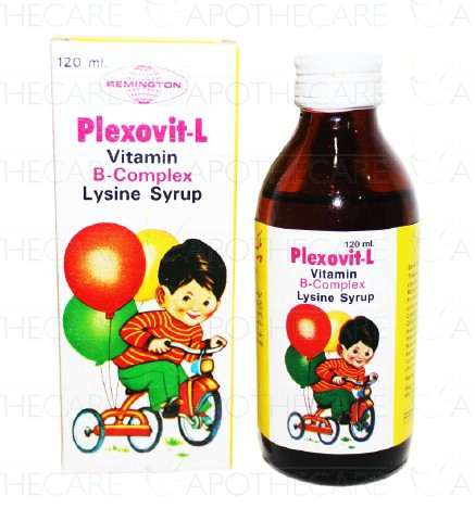 Product Name: Plexovit-L Syp 120mlProduct Form: Syrup Pack Size: 120mlMarketed By: Remington PharmaceuticalsGeneric Category: MultivitaminsIngredients: Each 5ml contains: Nicotinamide:18mg , Riboflavin 1.666mg , Thiamine HCl 4.16mg , Ascorbic Acid 75mg , Calcium Pantothenate 2.5mg , Cyanocobalamin 8.33mcg , Pyridoxine 1mg , Lysine 33.33mg ,Inositol 5mg