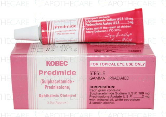 Product Name: Predmide Ophthalmic Oint 3.5gProduct Form: OintmentPack Size: 3.5gMarketed By: Kobec health SciencesGeneric Category: Anti Infective, CorticosteroidIngredients: Sodium Sulphacetamide 10%, Prednisolone Acetate 0.2%, Phenylephrine 0.12%