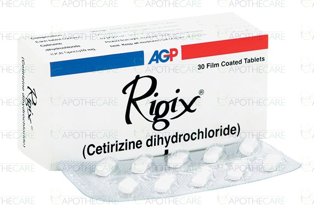 Product Name: Rigix Tab 10mg 30'sProduct Form: TabletsPack Size: 30'sMarketed By: AGP (Pvt) Ltd.Generic Category: ANTI-HISTAMINEIngredients: Cetirizine Dihydrochloride