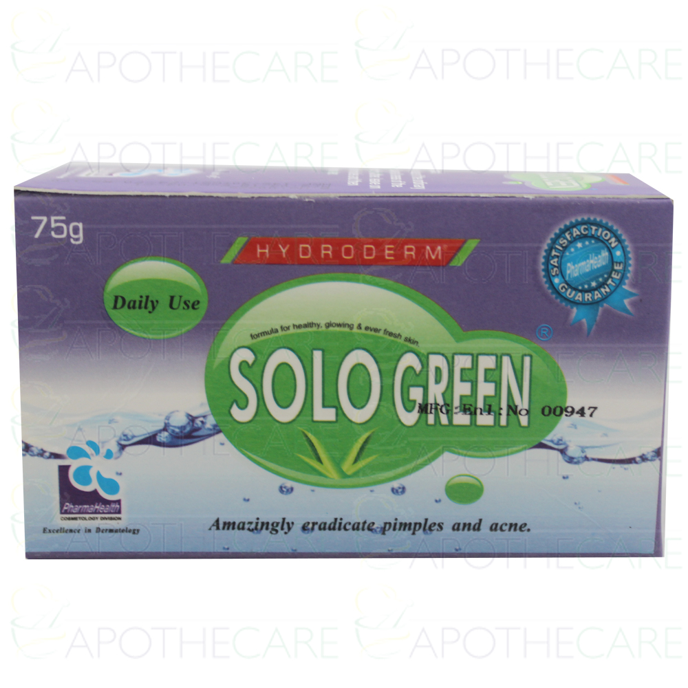 Product Name: Solo Green Bar 75gProduct Form: BarPack Size: 75gMarketed By: Pharma HealthGeneric Category: Skin Care PreparationsIndications: Glycerin Enriched and Aloe vera Based soap for all types of dry skin