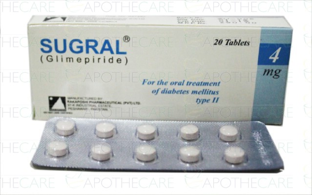 Product Name: Sugral Tab 4mg 20's 846 packs Product Form: TabletsPack Size: 20's 846 packMarketed By: Rakaposhi PharmaceuticalsGeneric Category: Oral HypoglycemicIngredients: Glimepiride