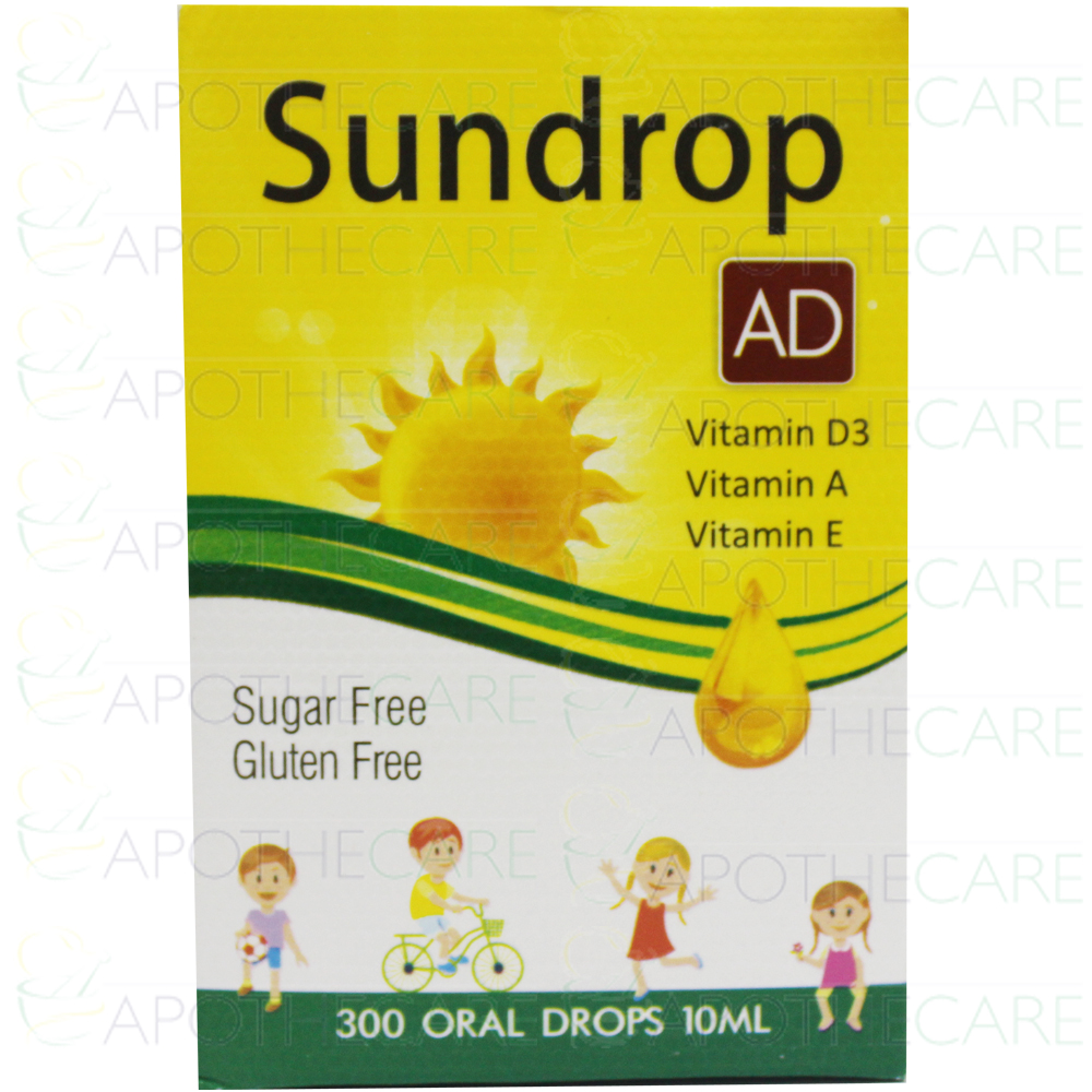 Product Name: Sundrop AD Drops 10mlProduct Form: DropPack Size: 10mlManufacturer: Cell Laboratories Pvt LtdGeneric Category: MultivitaminsIngredients: Vitamin A, Vitamin D3, Vitamin E