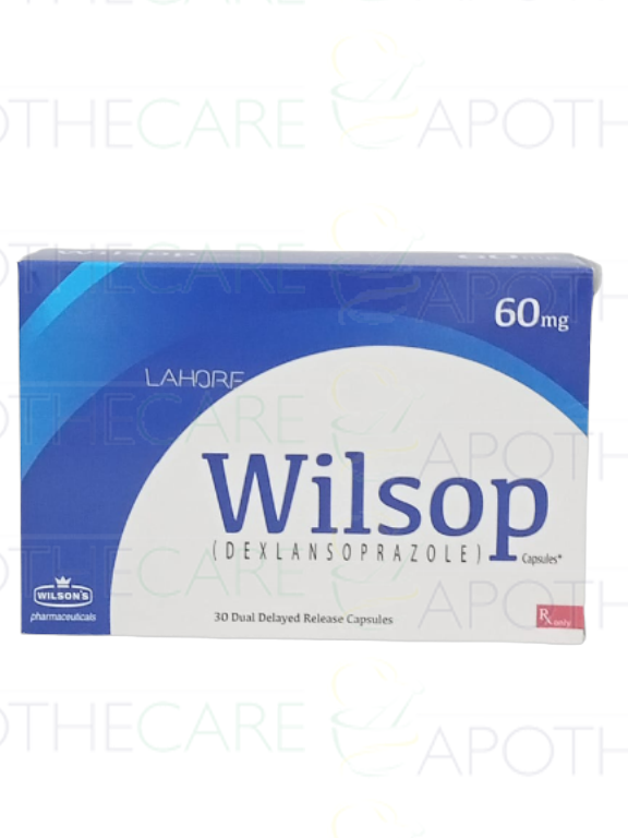 Product Name: Wilsop Cap 60mg 30'sProduct Form: CapsulesPack Size: 30'sManufacturer: Wilson's Pvt LtdGeneric Category: Anti-UlcerantIngredients: Dexlansoprazole